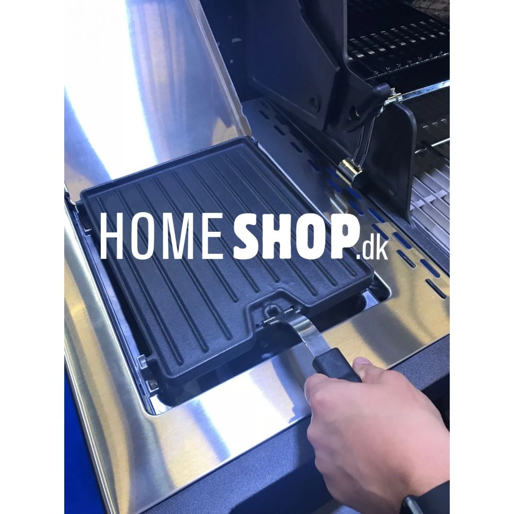 Den anden er stegepladen i støbejern som passer perfekt og kan klikkes ovenpå Powerzone brænderen – pladen er som man kender det fra eksisterende stegeplader glat med en kant rundt om på den ene side og – rillet på bagsiden hvis man ønsker det.