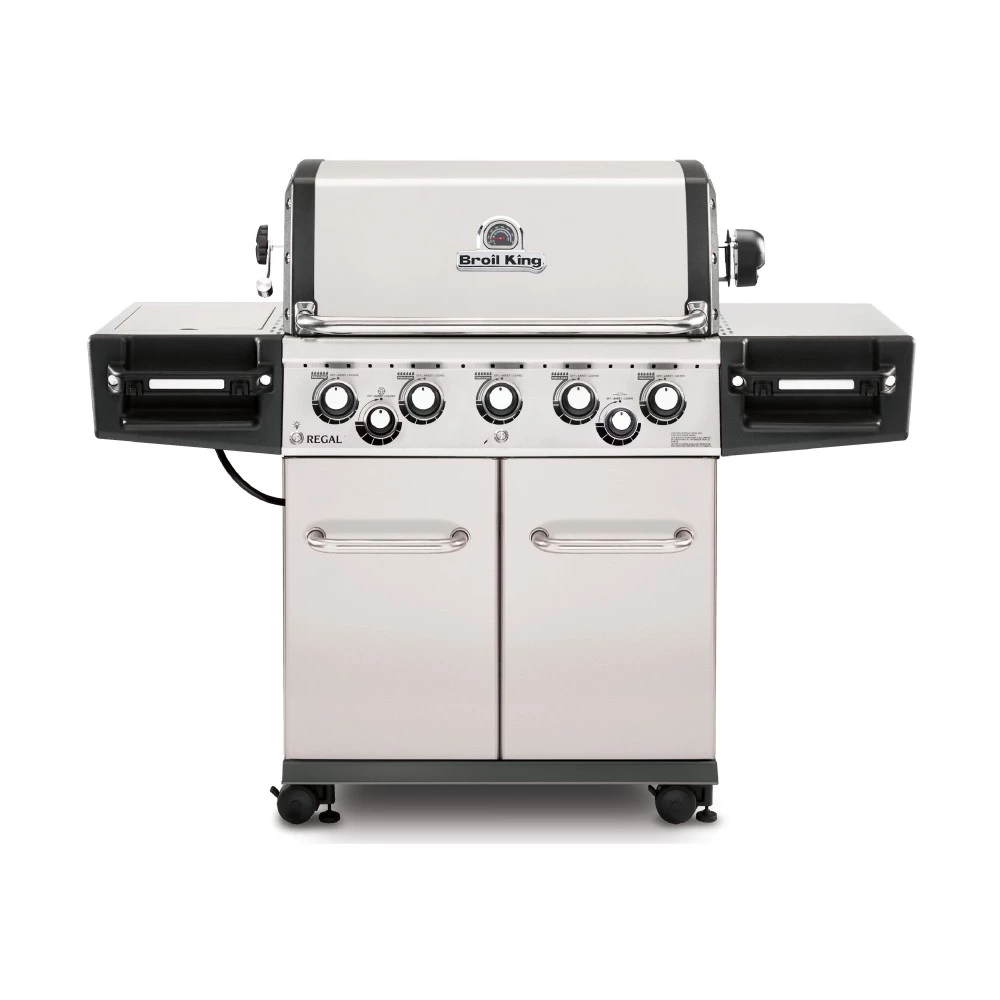 Broil King Regal 590 Pro har stor madlavning plads, og porcelæns belagt opvarmning rack, massivt rustfrit stål grillriste, rustfrit stål Flav-R-Wave ™ cooking system, 5 rustfrit stål Dual-Tube ™ brændere, rustfrit stål side hylder , belyste betjeningsknapper og et lukket kabinet base med pull-out gasflaske skuffe.