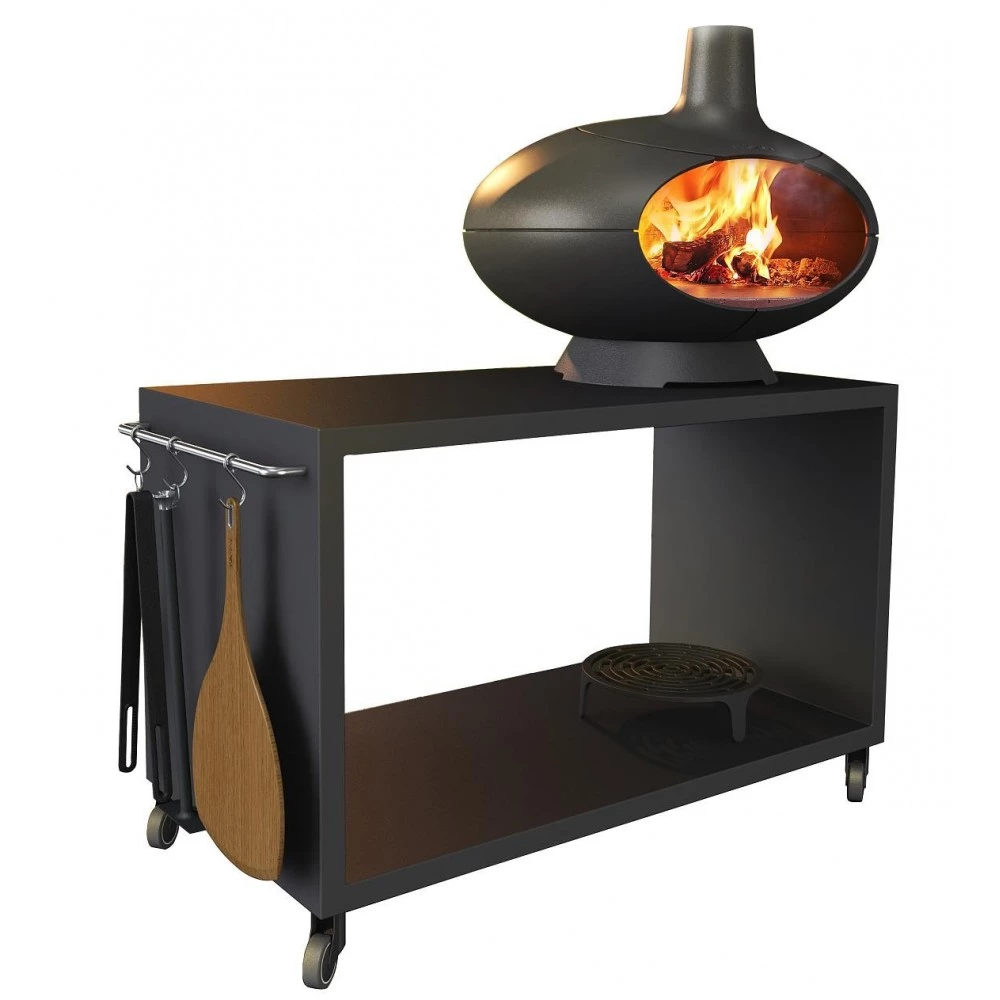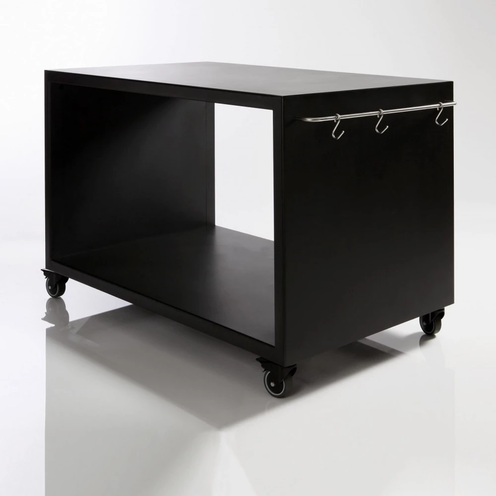 Bordet er fremstillet i pulverlakeret stål, og dets slanke konstruktion spiller smukt sammen med udeovnens runde former. I det store rum under bordet kan du opbevare brænde, krydderurter, og hvad en grillmester og pizzabager ellers måtte have brug for at have lige ved hånden.
