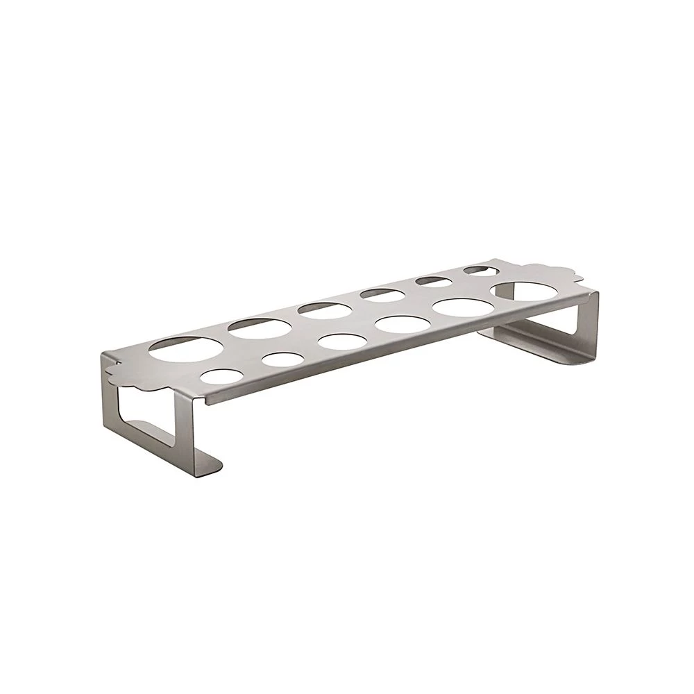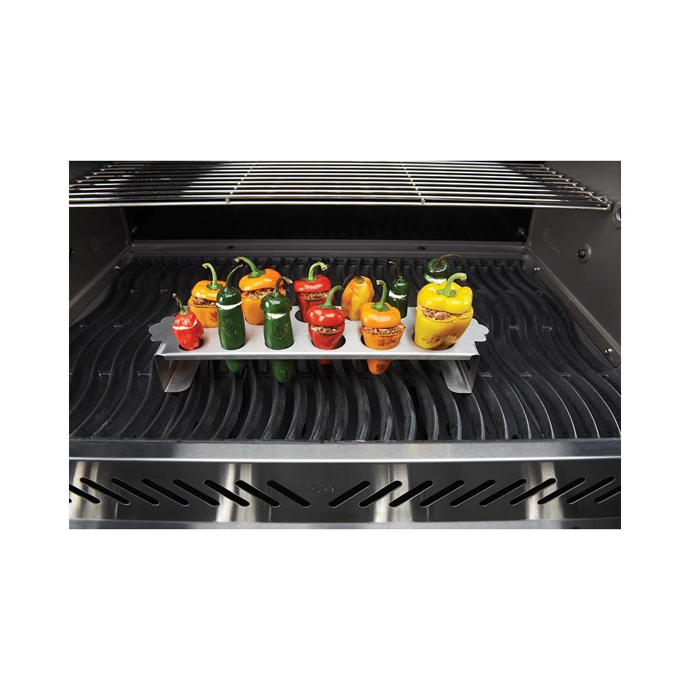 Den lille grøntsagsholder fra Napoleon har tolv huller i fem forskellige størrelser. Den passer til de fleste grøntsager men i sær mindre grøntsager som chili pebere og jalapenos. Holderen er lavet i rustfri stål og rengøres nemt i opvaskemaskinen eller med vand og sæbe. Når du griller grøntsager i Napoleon Grøntsagsholder bliver grøntsagerne løftet 5 cm over grillristen og derved bliver varmen jævnt fordelt hele vejen rundt. I pakken finder du, udover grøntsagsholderen, også en opskrift på fyldte jalapeno pebere.