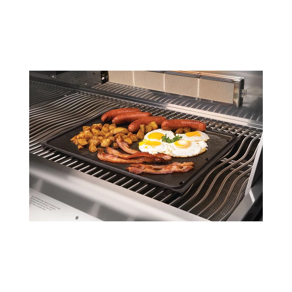 Fra dit komfur kender du pladen som en grillpande og grillpladen i støbejern kan lave det hele. Den flade side fungerer suverænt til sydende bacon, spejlæg, kartofler, karamelliserede løg, brunch-pølser, pandekager mv. mens den rillede side giver Napoleons fine Wave-stegestreger samtidig med at fedtet let kan løbe fra dine frikadeller, nakkekorteletter eller måske hakkebøfferne til din grillede burger.